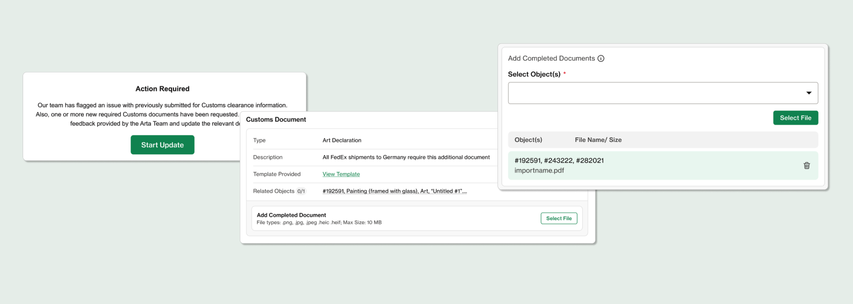 Arta will now have a section for required documents within our Electronic Customs Documents (ECD) form. We will alert the exporter if a document is required and, if available, we will provide a template.